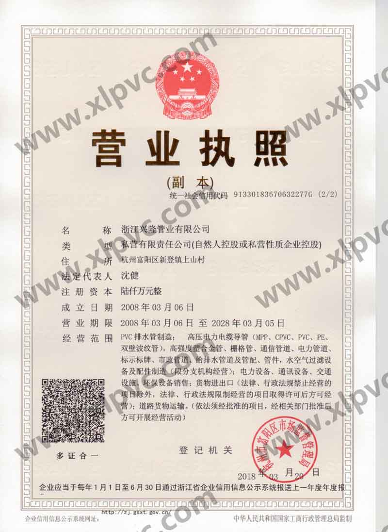 浙江興隆管業有限公司位于杭州市富陽區(杭州第九新區),坐落在新登鎮,相距杭州僅60公里,水、陸、空交通運輸十分便利。浙江興隆管業有限公司前身為富陽興隆塑料制品廠,成立于1992年,2008年改名浙江興隆管業有限公司,數十年來,公司一直至力于管道的生產,目前公司擁有國內先進的CPVC保護管生產線,HPVC()雙壁波紋管生產線,多孔管生產線,玻璃鋼電纜保護管生產線、MPP電纜保護管生產線。生產的主要產品有:CPVC電纜保護管、MPP電力電纜保護管(頂管)、高強度塑合金管、HDPE給排水管、HPVC()雙壁波紋管、玻璃鋼電纜保護管、埋地通信用的PVC-U多孔管、PE直壁管、PVC-U雙壁波紋管、梅花管等,年生產能力達20000萬米。